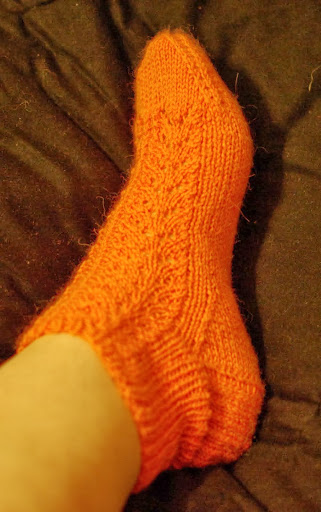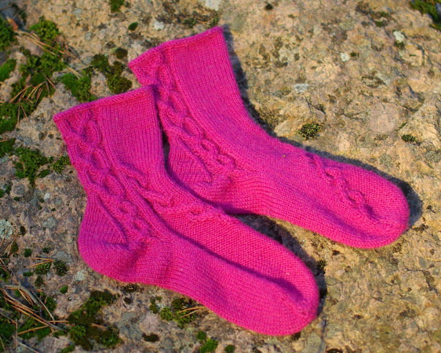 Näihin sukkiin tein ensimmäistä kertaa eläissäni sädekavennuskärjen. Tuttavuus oli todella miellyttävä ja teen jatkossa toistekin, jos sukkien malli sen muuten sallii. Jostain syystä sitä aina jumittuu nauhakavennukseen ja tekee sen suuremmin ajattelematta. Muutaman kokeilun jälkeen tuo sädekavennus tuntuu kuitenkin jalassa huomattavasti miellyttävämmältä.