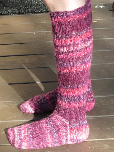 Serkku sai sitä, mitä pyysi. Riittävän pitkät sukat, joissa pintaneule ei estä aktiivikäyttöä kengissä. Minä sain sitä, mitä tarvitsin: tekemistä sairasvuoteelle ja sukat, joita oli mukava tehdä. Saaja veti sukat jalkaansa heti elokuun alussa ja on esitellyt sitä niin moneen kertaan erilaisissa yhteyksissä. Tämä on poikinut sukkatoiveita monelta sukulaiselta. Täytetään niitä sitä tahtia, kun ehditään.